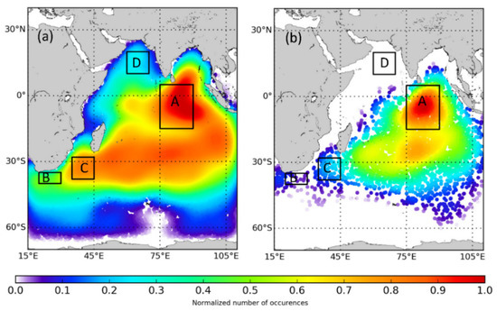 Distribution of Indian Ocean crossing swells from (a) all Level-2 swell observations and (b) only refocused in Level-3 “fireworks”, respectively, for 10-years Envisat wave mode Advanced Synthetic Aperture Radar (ASAR).