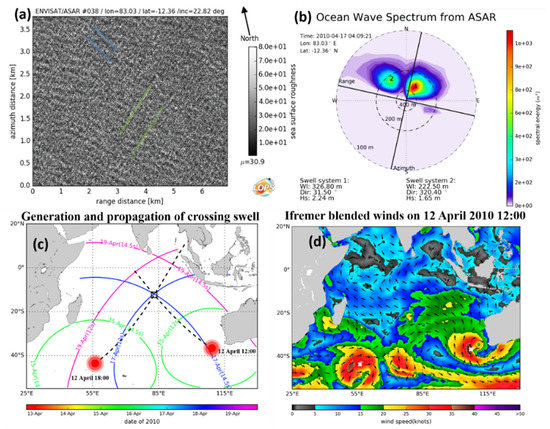 Although consistent with previous studies [6,7] regarding geographical distribution, extra properties of the pool and its forming mechanism (e.g., origins and pathways) could be further investigated using “fireworks”. We first illustrate this by the representative crossing swell case that occurred in Region A (Figure 2). This event was captured by refocused ASAR “fireworks” data on 17 April 2008 at 12.36°S/83.03°E (black box in Figure 2c). The crossing swell, i.e., two systems propagating northwestward and northeastward, is clearly presented in the ASAR spectral retrieval, and js also visible from the imagette (blue and green lines indicating wave crests of two swells respectively overlaid on Figure 2a).