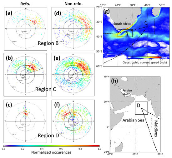 Spectral statistics of swell partitions from (a–c) refocused and (d–f) non-refocused ASAR WM spectra in “fireworks” for the Regions of B, C, and D. Maps for (g) Region B and C, with colors representing GlobalCurrent currents (2003–2012 average), and (h) Region D.