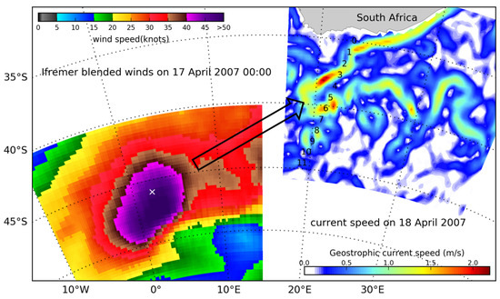 Typical Example of crossing swells in Region B. Right of map illustrates ASAR observed swells (numbered from 0 to 11) in the Agulhas Current (color-coded GlobCurrent current speed) on 18 April 2007. These swells were originated from the extra-tropical cyclone on 17 April (on the left, with color representing Ifremer blended winds, and white cross indicating “fireworks” determined swell origin).