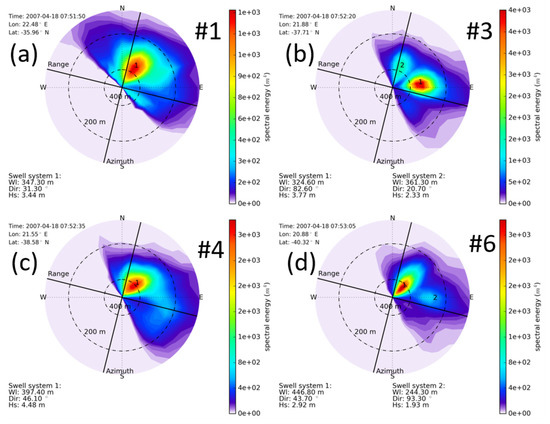 (a–d) Swell spectra from Envisat ASAR imagettes #1,3,4,6 in Figure 5.