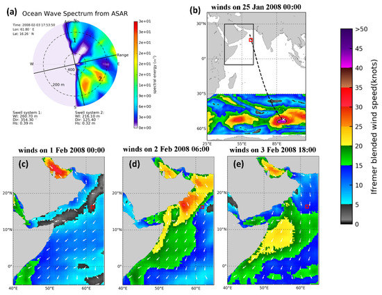 Example of crossing swell in the Arabian Sea. (a) ASAR observed two-dimensional (2-D) swell spectrum on 3 February 2008. Maps of Ifremer blended winds generating (b) Southern swell and (c–e) shamal swell on 25 January and 1–3 February, respectively.