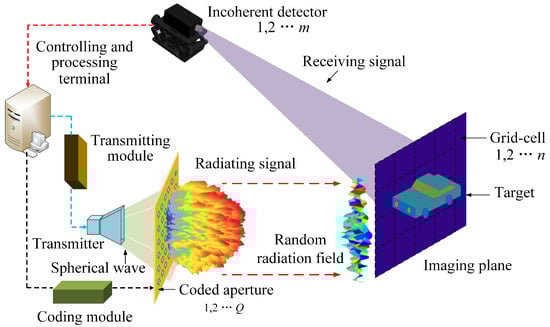 Originating from optical coded-aperture imaging [,] and radar coincidence imaging [,,], terahertz coded-aperture imaging (TCAI) exploits aperture coded antenna [,] to modulate the THz wave randomly, and to achieve spatiotemporal independent wave distribution. By sequentially sampling the pseudo-randomness echo signals, the matrix-imaging equation can be established. And the target scattering coefficients can be solved through computational imaging method []. TCAI has many significant advantages such as high resolution, high frame-rate, all-time functionality. And the forward-looking and staring imaging capability can be obtained without relying on any relative motion between radar and target [], which is different from synthetic aperture radar or inverse synthetic aperture radar. Therefore, the TCAI technique has potential applications in nondestructive detection [], anti-terrorism checks[,], terminal guidance [] etc.