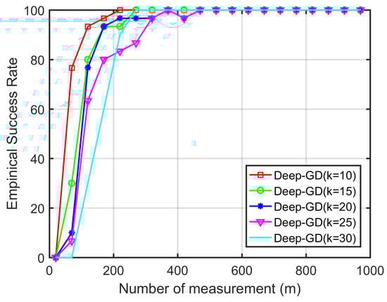Empirical success rate of Deep-GD at different measurements m under different k.