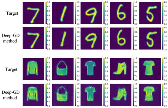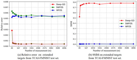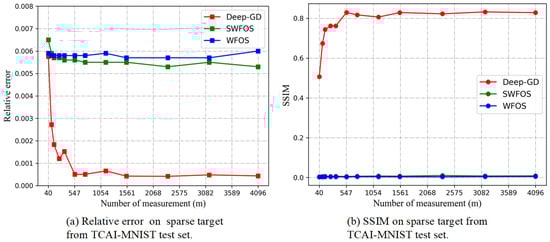 Quantitatively, the relative error and SSIM comparisons under different measurements are described in Figure 7a,b, respectively. It can be seen that our algorithms can achieve good recovery with only 547 measurements while the other algorithms cannot, the relative error is below and SSIM is around 0.8. And both indexes can be improved slightly by increasing m with the similar phenomena with the results for fully-connected generator. But there are some oscillations, which can be attributed to the highly nonconvex property of DCGAN model and the property of the generative model. Also, we note that the imaging performance of the Deep-GD algorithm is ultimately bounded by the DCGAN’s representational error, which is consistent with the visualization shown in Figure 6. Nonetheless, our algorithm can solve the scattering coefficient of sparse targets under the intensity measurements m less than n.