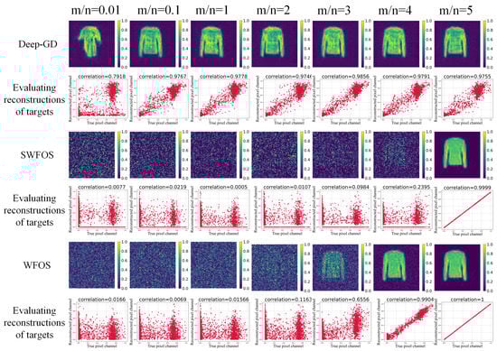 Compared with the classical imaging technology, the proposed method cannot reconstruct the targets that are not in the range of a generative model G as in [,,], and its reconstruction results under high intensity measurements are not as perfect as other methods. However, it can use the prior information provided by the generative model to achieve the high-resolution reconstruction of targets with different sparseness when the intensity measurement , which greatly reduces the complexity of solving the target scattering coefficient and the difficulty of hardware required for the echo signal detection.