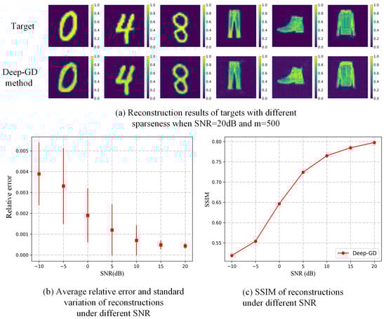 To examine the noise resistance and stability of the proposed Deep-GD method, we have added the white Gaussian noise to the echo signal. The quantitative and qualitative results are shown in Figure 10. The intensity measurement m is set to 500 and SNR = 20 dB. Figure 10a shows the reconstruction results of targets with different sparseness, and the sparseness of the original target is 0.5764, 0.5999, 0.6087, 0.587, 0.5937, 0.5065, respectively. For quantitative results, we test 10 sparse targets from the test set of TCAI-MNIST data set and 10 extended targets from the test set of TCAI-FMNIST data set, which is similar to the method used to analyze imaging efficiency. The average results are displayed in Figure 10b,c. One can see that the presented method is of good robustness against noise and a good stability at SNR > 10 dB when intensity measurement .
