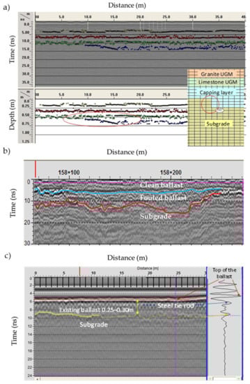 - Brough, M.; Stirling, A.; Ghataora, G.; Madelin, K. Evaluation of railway trackbed and formation: A case study. NDT E Int. 2003, 36, 145–156. [Google Scholar] [CrossRef]