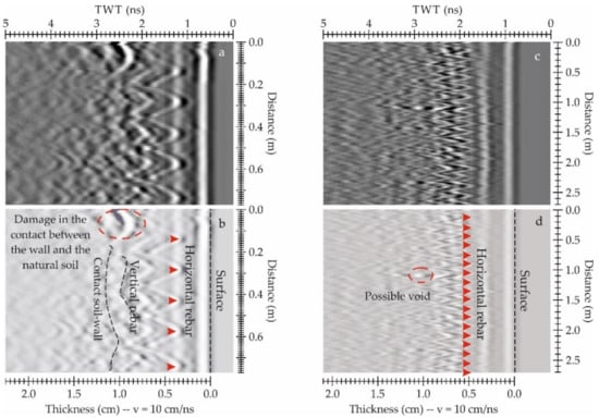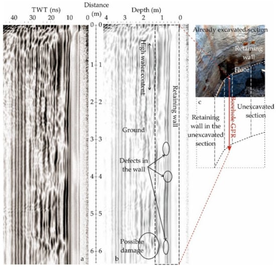 - Hugenschmidt, J.; Mastrangelo, R. The inspection of large retaining walls using GPR. In Proceedings of the 2007 4th International Workshop on Advanced Ground Penetrating Radar, Napoli, Italy, 27–29 June 2007; IEEE: New York, NY, USA, 2007; pp. 267–271. [Google Scholar]