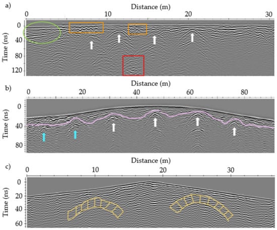 - Santos-Assunçao, S.; Perez-Gracia, V.; Salinas, V.; Caselles, O.; Gonzalez-Drigo, R.; Pujades, L.G.; Lantada, N. GPR backscattering intensity analysis applied to detect paleochannels and infilled streams for seismic nanozonation in urban environments. IEEE J. Sel. Top. Appl. Earth Obs. Remote Sens. 2015, 9, 167–177. [Google Scholar] [CrossRef]