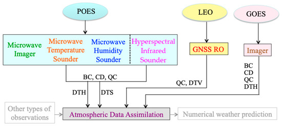 Observations are the motivation for conducting atmospheric data assimilation. The data assimilation provides initial conditions for numerical weather prediction (NWP) models and generates a reanalysis dataset for studying atmospheric dynamics and climate change. More than 95% of assimilated data are satellite observations [10]. Figure 1 shows the following six major satellite instruments providing data for numerical weather prediction: microwave imager, microwave temperature sounder, microwave humidity sounder and hyperspectral infrared sounder onboard POESs, the global navigation satellite system (GNSS) radio occultation receiver carried by low orbit satellites (LEO), and imager onboard geostationary environmental satellites (GOES). The POES and GOES observations of thermal radiation at different frequencies measured by different instruments are mainly determined by the atmospheric state at different altitudes. The GNSS radio occultation observations are also routinely assimilated in research and operational data assimilation systems. The GOES imager can provide high temporal and horizontal resolution imager data in the visible, near infrared and infrared electromagnetic spectrum at the highest horizontal resolution. Whether and how much satellite data assimilation can improve the level of numerical weather prediction depends on the research work of satellite data bias estimation, cloud detection, quality control, NWP model resolution dependent data thinning, etc.