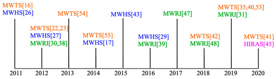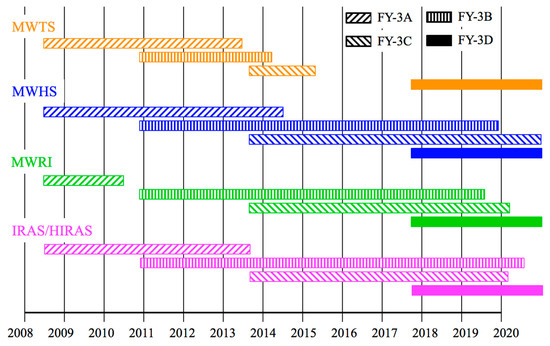 The instrument lifetime of FY-3 MWTS, MWHS, MWRI and IRAS/HIRAS from http://satellite.nsmc.org.cn/PortalSite/Data/DataView.aspx (accessed on 11 February 2021).