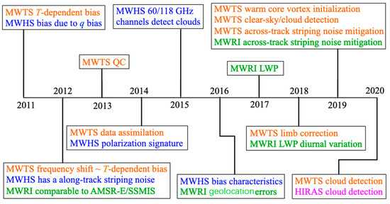Our studies of FY-3 observations over the past 10 years mainly covered the following topics: (i) bias characterization and estimate for MWTS and MWHS sounding channels, (ii) detection and mitigation of striping noise, (iii) detection of RFI signals in the 10.65-GHz MWRI channel, (iv) estimate and improvement of geolocation accuracy for MWRI data, (v) cloud detection for MWTS and HIRAS data, (vi) liquid water path (LWP) retrievals for MWTS/MWHS combined and MWRI data, (vii) quality control for MWTS data assimilation, and (viii) limb correction and warm core retrievals for monitoring and vortex initialization of tropical cyclones (TCs). The major topics addressed in each year’s papers shown in Figure 3 are briefly highlighted in Figure 4 and summarized below.