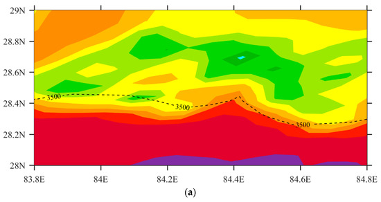 We show the spatial distributions of brightness temperature observations within the 1° × 1° area centered at (84.3°E, 28.5°N) before and after the geolocation error correction (Figure 6a,b) and we compared them with the AMSR-2 observations (Figure 6c). As a position reference, the 3.5 km terrain height is indicated by a black dashed curve in Figure 6. The distribution of brightness temperature (Figure 6a) is shifted northward by the geolocation error correction (Figure 6b). The later compares more favorably with AMSR-2 observations (Figure 6c).