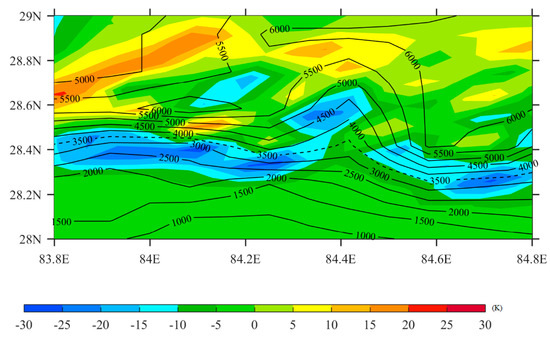 geolocation error correction at 0455 UTC 1 January, 2014. The terrain height is indicated by black solid and dashed curves.