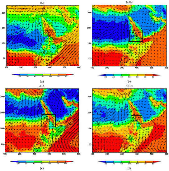 Relative humidity (RH) (%) at 1000hpa vs. synoptic winds (ms−1) over the Red Sea, Eritrea, Middle East, East and Horn of Africa, and Northeastern Africa during (a) winter (December–January–February (DJF)), (b) summer (June–July–August (JJA)), (c) spring (March–April–May (MAM)) and (d) autumn (September–October–November (SON)). Shaded contours represent relative humidity, and the arrows represent the wind.