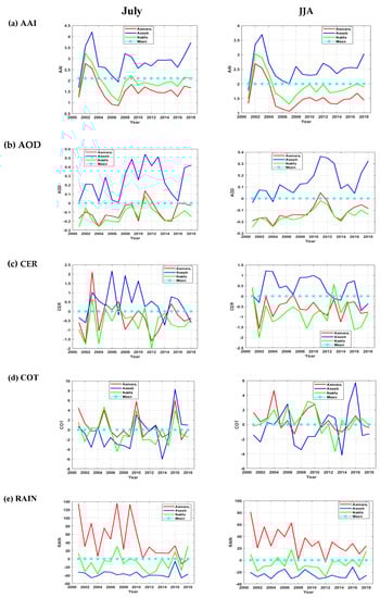 Monthly (July) and seasonal (JJA) anomalies are used in this study to detect the variabilities in AAI, AOD, CER, COT, and rainfall. The anomaly analysis used refers to the period from 2001 2018. The anomaly is a quite useful tool that can aid in a series of deviations from the average (mean) value. MATLAB is the tool used to both calculate and plot the anomaly. Mathematically, the anomaly is calculated as follows: