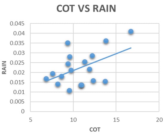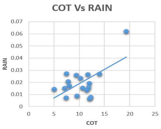 Scatter plot of COT vs. rainfall over Assab in JJA that shows the correlation plot of highlighted bold values given in Table 8.