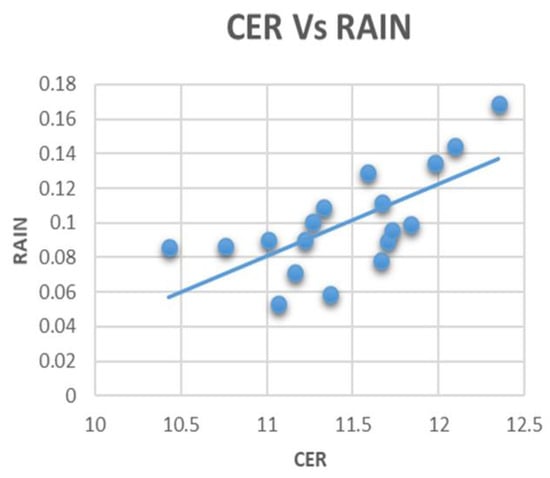 Scatter plot of CER vs. rainfall over Asmara in JJA that shows the correlation plot of highlighted bold values given in Table 7.