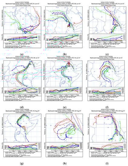 HYSPLIT back trajectory during the start (a, b, c), middle (d, e, f), and end (g, h, i) of JJA of the year 2007.