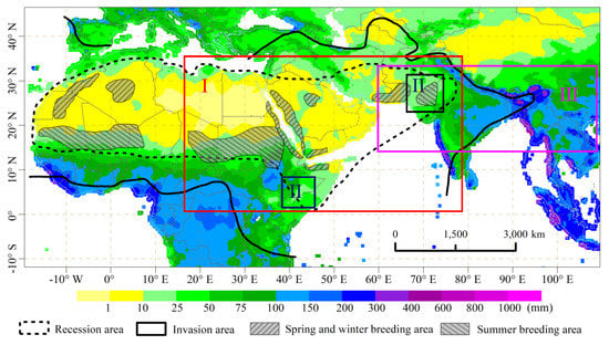 The spatial distribution of the annual rainfall in the breeding area, recession area and invasion area of the African desert locust.