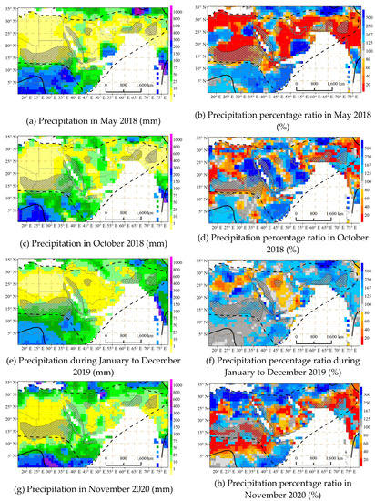 Precipitation and its percentage ratio over part I of the study area during 2018–2020.