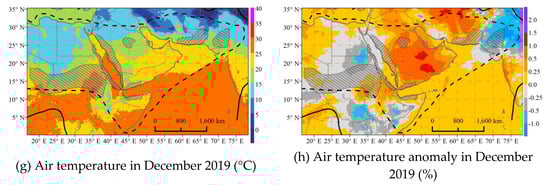 Apart from rainfall events, a high air temperature and land surface soil temperature, especially the high temperatures in months from April to December, will significantly decrease the period of egg incubation and hopper development, thus providing appropriate conditions for the rapid development of each desert locust generation. Here, the 2-m air temperature as well as its anomaly compared to the past decade across the study area in the warmest month (June) and coldest month (December) in 2018 and 2019 are mapped as Figure 3. According to Figure 3, the study area in June 2018 and 2019 has experienced a high and favorable air temperature (30~40 °C) in the entire Arabian Peninsula, summer and spring breeding areas in the West Asia and the both sides of the Red Sea (Figure 3a,e), thus accelerating the locust breeding, development and migration. In December 2018 and 2019, a large proportion of the study area, including the south Arabian Peninsula, the winter breeding areas in both sides of the Red Sea and the north Somalia, still have an air temperature higher than 20 °C (Figure 3c,g), which continued the locust production and migration in winter. Additionally, the study area has experienced slightly higher air temperatures in most parts compared with the averaging monthly air temperature of the past ten years under the influence of global climate change. In 2018, the south and west of the study area showed a negative air temperature anomaly in June (Figure 3b) and December (Figure 3d), respectively. The air temperatures in other areas were higher than the norms, especially the Arabian Peninsula, whose air temperature anomalies in December was generally more than 0.5%. The area with a higher air temperature in 2019 (Figure 3f,h) was enlarged than 2018.