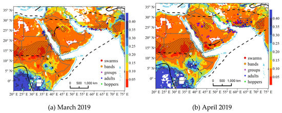 Unlike the Arabian Peninsula, the West Asia and East Africa, including the summer locust breeding area near the Indo-Pakistan border and the winter locust breeding area in the Somalia Peninsula, had a favorable soil moisture (between 0.05~0.20 cm3/cm3) for the egg laying of locust from the spring 2019 to early 2020 (Figure 5), thus provided adequate food and environmental conditions for breeding and the development of the newly arrived locust swarms. Therefore, vast locust swarms gathered in the Indo-Pakistan border area since the spring 2019 (Figure 5a–c) and expanded gradually until January 2020 (Figure 5l). Then, the number of locust swarms decreased dramatically in February 2020 due to the local and international preventive and controlling strategies, as well as the lower soil moisture than the earlier months (Figure 5k). Regarding East Africa, the areas with soil moisture distributed between 0.10~0.20 cm3/cm3 were located in Somalia, North Kenya and East Ethiopia from October to November 2019 (Figure 5h,i), thus allowing the swarms to move southeastwardly into the Somalia Peninsula and conduct successful production subsequently. The Somalia and East Ethiopia had become dry since January 2020 (Figure 5k), and the drought conditions had been worsened in the next two months. The appropriate and moist regions had passed southwestwardly to South Kenya and Ethiopia during January and February 2020 (Figure 5k,l). Accordingly, the Somalia and East Ethiopia desert locust swarms moved towards the southwest to those regions since the early 2020. Additionally, the area with a soil moisture between 0.10~0.15 cm3/cm3 in the winter breeding area in the Arabian Peninsula and the south Yemen was significantly enlarged than the previous months in the early 2020, which led to the reappearance of vast swarms in this region (Figure 5k). It is obvious that the soil moisture distribution was highly relevant to the distribution and movements of desert locust swarms. The spatial–temporal variation patterns of the soil moisture across West Asia and East Africa corresponded well with the migration routine of the desert locust swarms.