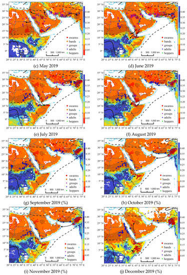 The precipitation anomalies during 2018–2019 were caused by several rare cyclones and tropical storms, mainly cyclone Mekunu in May 2018, cyclone Luban in October 2018 and cyclonic storm Pawan in December 2019 [4]. Here, the precipitation and precipitation percentage ratio compared with the historical reference over the breeding areas of the desert locust are shown in Figure 2. According to Figure 2a,b, the precipitation in West Oman and East Yemen was between 100 and 300 mm, and the percentage ratio of the precipitation reached 500%, indicating significant abnormal precipitation amounts across the South Arabian Peninsula. As a result, several lakes formed in the interior along the border between Yemen and Oman and in the edges of the Empty Quarter (http://www.fao.org/ag/locusts/en/info/info/index.html), thus providing favorable conditions for locust breeding and reproduction. Figure 2c,d indicate a remarkable precipitation anomaly over the most parts of the Empty Quarter, the interior of Sudan and Eritrea and the Red Sea coastal plains in October 2018, which strongly supported the formation of desert locust groups in these areas. Furthermore, the remarkable precipitation anomaly in the Empty Quarter, where the control operations for the growing desert locusts were unavailable, have significantly augmented the locusts’ development. The heavy rain brought by the two cyclones in May 2018 and October 2018 provided favorable breeding conditions beginning in June 2018 and enabled the continuous and successful breeding of multiple desert locust generations. In 2019, the total precipitation across the central of the Arabian Peninsula sharply declined to approximately 50% of the annual precipitation in normal years, while the precipitation percentage ratio in the Somalian Peninsula and West Asian countries, including the southwest Iran, Afghanistan, Pakistan and West India, reached 125%~500% compared with the historical reference (Figure 2e,f). Among those areas, the southwest Iran, with the precipitation over 75 mm (Figure 2e) and the precipitation anomaly reaching 125% (Figure 2f) allowed a westward extension of the spring breeding area of the locusts, thus strongly supported the locusts’ breeding in spring and the invasion process of the swarms towards the Indo-Pakistan border at the beginning of the summer. In general, the abundant rain in those areas around the Arabian Peninsula forced the desert locusts from the Arabian Peninsula migrated towards northwest to the southwest Iran in early 2019, and then migrated to the Indo-Pakistan border after the successful spring breeding. In addition, it supported the southwardly migrated swarms into the East Africa in 2019. Then the numerous locust swarms appeared around the East Africa and the Indo-Pakistan border, thus triggering the locust upsurge in East Africa and West Asia. The swarms have been invading, spreading and laying eggs in the East Africa during 2020, and the swarms are expected to lay eggs and growing in numbers in north Somalia, which received heavy rainfalls from cyclone Gati in November 2020, as well as the other east African countries with sufficient rainfalls (Figure 2g,h), thus increasing the risk of prolonging the desert locust upsurge in the area.