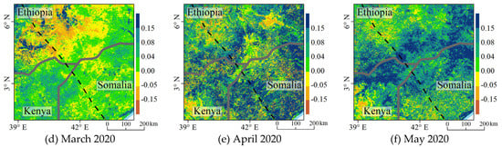 Kenya, Ethiopia and Somalia are important agricultural countries in East Africa, where forages, crops and food security have been seriously threatened by the vast desert locust swarms that have migrated from the Arabian Peninsula since the end of 2019. Figure 6 shows that the swarms have been gathered near the borders of Ethiopia, Somalia and Kenya (E-S-K border region) for a long time since December 2019. Therefore, in this study, the NDVI anomaly variation patterns across this region from December 2019 to May 2020 were mapped, to assess the impacts on local vegetation caused by this locust crisis, as shown in Figure 6. Considering that the vegetation loss caused by the desert locust swarms cannot be detected in the NDVI anomaly maps until the vast locust swarms have settled the area for a long time, the locust swarm distributions and movement were analyzed one or two months prior (http://www.fao.org/ag/locusts/en/info/info/index.html) to identify the areas destroyed by the locust swarms. According to the movement of the swarms, scattered locust bands and groups showed up in north Somalia and East Ethiopia since November 2019, and a number of swarms became visible and moved southwardly into Kenya in December 2019, which corresponded well with the areas exhibiting the negative NDVI anomalies from December 2019 to February 2020 (Figure 6a–c). The desert locust swarms grew dramatically and severely damaged East Africa beginning in January 2020, and the swarms in Somalia migrated towards southwest to Kenya and South Ethiopia in January, and then moved eastward to North Uganda in February 2020, respectively. Thus, the vast migrated desert locust swarms have been causing great vegetation losses in this area by March 2020, especially the South Ethiopia, where a large proportion have a NDVI anomaly lower than −0.05 (Figure 6d). The proportion of the areas with negative NDVI anomalies increased significantly in Kenya during April and May 2020 (Figure 6e,f), which corresponded well to the distribution and southwestwards movement of the desert locust swarms at earlier times, and with the subsequent onset of the monsoon rains.