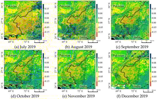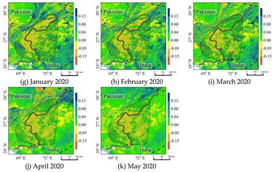 Spatial–temporal patterns of the NDVI anomalies near the Indo-Pakistan border from July 2019 to May 2020.