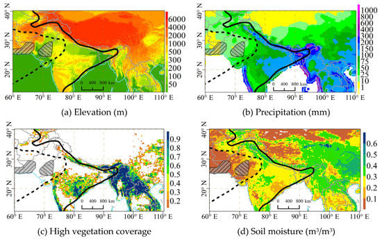 Because the expanding and eastwardly migrating desert locust swarms have been threatening East India, the Indochina Peninsula and Southwest China, this study mapped the spatial distribution patterns of the average soil moisture and high vegetation coverage during 2008-2019, as well as the elevation across the study area (part III) (Figure 8), to analyze the possibility of desert locust swarms flying to the Indochina Peninsula and Southwest China. According to the biological characteristics of desert locust, desert locust swarms take off under suitable climatic conditions, such as air temperature (20~40 °C) and wind speed (<6 m/s). Generally, the maximum flight height is no more than 1700 m, and they are easily restrained by heavy rain and flourishing vegetation [18]. According to Figure 8a, the desert locust swarms cannot continue moving northward across the Himalayas and other high mountains due to the restrictions caused by elevation (>2000 m). East India has a significantly higher precipitation (>100 mm) than that in the locust breeding areas (Figure 8b) and is widely covered by dense vegetation (Figure 8c), which will inhibit the eastward migration of locust swarms. The countries and regions near the locust swarms’ historical invasion borders, such as Nepal, Bhutan, Burma, Thailand and Yunnan Province of China, have high precipitation (>200 mm) and perennial vegetation coverage as high as 0.9 (Figure 7b,c). Thus, the arrival of locust swarms is likely to be stopped by heavy rainfall and scattered by dense vegetation. In addition, the desert locusts are likely to perish even after they migrated into the Nepal, east India and further eastwards due to the fungal growth and the natural infection promoted by the local humid tropical conditions. In this case, the chance that the desert locust swarm will migrate across the region with a high density of vegetation and continue flying into the Indochina Peninsula and Southwest China is very low. In addition, the reproduction of desert locust requires appropriate soil moisture. Figure 8d demonstrates a much moister soil in the eastern area outside the invasion border and Figure 8d demonstrates a much moister soil in this area (>0.3 m3/m3) than in the summer and winter desert locust breeding areas (<0.2 m3/m3). Besides the appropriate soil moisture, the reproduction of the desert locusts has to be in the open areas of sandy soil with very low air humidity, which are not broadly exist beyond the east India. In conclusion, there is little chance that the desert locust swarms will migrate into the Indochina Peninsula, Southeast China and the eastern areas outside the locusts’ historical invasion borders.