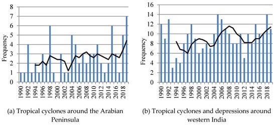 Many researchers have linked the risk of fires and pest and pathogen outbreaks to the frequency and severity of extreme climatic events [1,34]. Considering that desert locust upsurges are closely related to climatic condition anomalies caused by more frequent tropical cyclones and depressions, we analyzed the trends in tropical cyclone and depression frequencies around the Arabian Peninsula and western India during 1990–2019 using the five-year moving average method, as shown in Figure 9. The annual frequency of cyclonic disturbances (maximum wind speed of 17 knots or more), cyclones (34 knots or more) and severe cyclones (48 knots or more) over the Bay of Bengal (BOB), Arabian Sea (AS) and land surface of India was published by the website of the India Meteorological Department (IMD) (www.imd.gov.in). According to Figure 9, an increasing trend is observed in the frequency of tropical cyclones and tropical depressions around the Arabian Peninsula and the West Indian Ocean, which will lead to more precipitation and environmental anomalies in the breeding areas of the desert locusts. If this trend continues as part of climate change, conditions are likely to become increasingly suitable for desert locust upsurges, which means that the sensitivity of the disaster warning system should be enhanced, and more effective prevention and control measures will need to be developed.