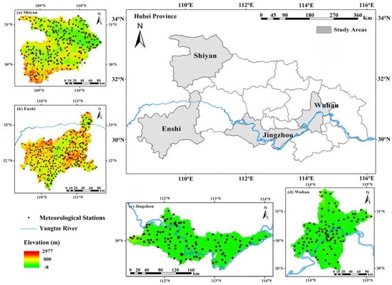 Location of the Shiyan (a), Enshi (b), Jingzhou (c), and Wuhan (d) regions in Hubei province and spatial distribution of the meteorological ground stations in each region.