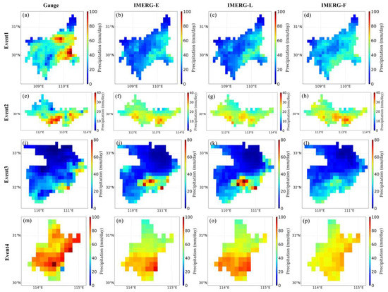 Spatial distribution of mean daily precipitation for gauges (a,e,i,m), IMERG-E (b,f,j,n), IMERG-L (c,g,k,o), and IMERG-F (d,h,l,p) over four regions and periods during the four extreme precipitation events, which are Event 1 (a–d), Event 2 (e–h), Event 3 (i–l), and Event 4 (m–p).