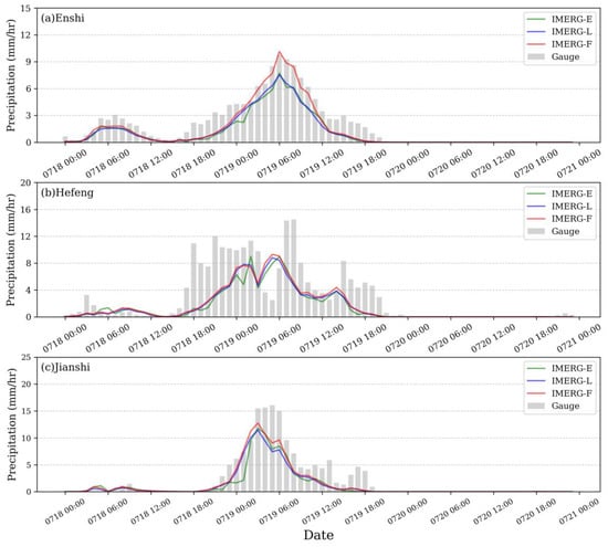 Average hourly precipitation of the three IMERG precipitation products and gauge-based precipitation data in Event 1 over Enshi (a), Hefeng (b), and Jianshi (c) regions between 18 and 20 July 2016.