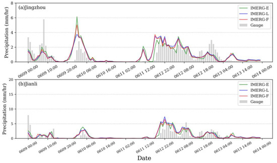 Average hourly precipitation of the three IMERG precipitation products and gauge-based precipitation data in Event 2 over Jingzhou (a) and Jianli (b) regions between 9 and 13 June 2016.