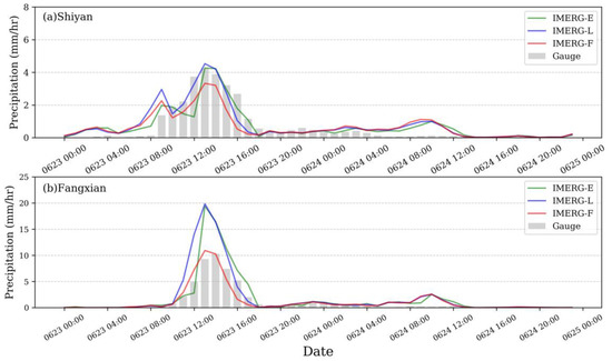 Average hourly precipitation of the three IMERG precipitation products and gauge-based precipitation data in Event 3 over Shiyan (a) and Fangxian (b) regions between 23 and 24 June 2016.