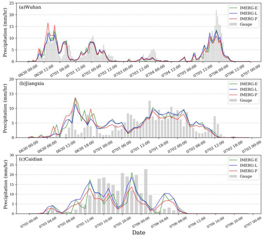 Average hourly precipitation of the three IMERG precipitation products and gauge-based precipitation data in Event 4 over Wuhan (a) region between 30 June and 6 July 2016, Jiangxia (b) between 30 June and 2 July 2016, and Caidian (c) between 5 and 6 July 2016.
