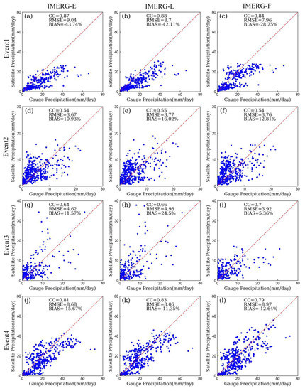 Statistical metrics for daily precipitation from IMERG-E (a,d,g,j), IMERG-L (b,e,h,k), and IMERG-F (c,f,i,l) compared with the gauge-based precipitation data for Event 1 (a,b,c), Event 2 (d,e,f), Event 3 (g,h,i), and Event 4 (j,k,l). The red dotted line denotes the 1:1 line.