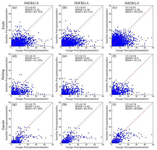 Statistical metrics for hourly precipitation from IMERG-E (a,d,g), IMERG-L (b,e,h), and IMERG-F (c,f,i) compared with the gauge-based precipitation data over Enshi (a,b,c), Hefeng (d,e,f), and Jianshi (g,h,i) in Event 1. The red dotted line denotes the 1:1 line.