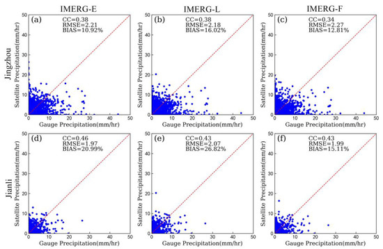 Statistical metrics for hourly precipitation from IMERG-E (a,d), IMERG-L (b,e), and IMERG-F (c,f) compared with the gauge-based precipitation data over Jingzhou (a,b,c) and Jianli (d,e,f) in Event 2. The red dotted line denotes the 1:1 line.