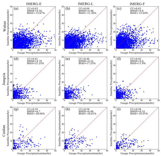 Figure 11 shows the scatterplots of the three IMERG precipitation products against gauge-based precipitation data to enable a statistical metric comparison of average hourly precipitation over Wuhan and two other precipitation centers (Jiangxia and Caidian) throughout the corresponding periods. In general, the scatter points distribution of the three IMERG precipitation products were similar in the three regions. Although the three IMERG precipitation products overestimated precipitation in Jiangxia but underestimated precipitation in Wuhan and Caidian, the accuracy of the three IMERG precipitation products was relatively consistent (Table 3). Overall, as the statistical metrics show, IMERG-F had a relatively higher CC and lower RMSE and BIAS values than those of IMERG-E and IMERG-L in Enshi and Shiyan. However, CC, RMSE, and BIAS values of the three IMERG precipitation products were close in Jingzhou and Wuhan.
