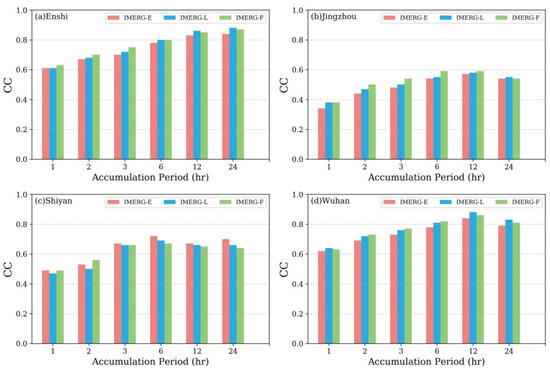 The correlation coefficient (CC) for different accumulation periods from IMERG-E, IMERG-L, and IMERG-F compared with the gauge-based precipitation data in areas of complex topography (Enshi (a) and Shiyan (c)) and less complex topography (Jingzhou (b) and Wuhan (d)).