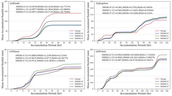Average cumulative precipitation observed by three IMERG precipitation products and gauge-based precipitation data, which for different accumulation periods over Enshi (a), Jingzhou (b), Shiyan (c), and Wuhan (d).