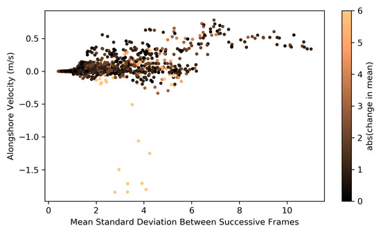 Alongshore velocity estimates from an example region (green box in Figure 3a) in the trough between the shoreline and sandbar are shown in Figure 4 to highlight several trends between local intensity distributions and predicted velocities. Distributions with large changes in the local mean between successive frames can result in anomalous large velocities (note that the relatively rare large positive velocities all occur with large frame-to-frame changes in brightness). Local brightness changes greater than 5 are thus considered as a proxy for the introduction or disappearance of targets, and all such returns are removed in postprocessing. Low local standard deviations also consistently result in optical flow returns of zero velocity, indicating that foam tracers were not present but not necessarily ruling out that water was not flowing at that time. All velocity estimates occurring during instances of standard deviations less than 2 are discarded as potentially poor estimates due to not adhering to the underlying assumptions of the optical flow algorithm.