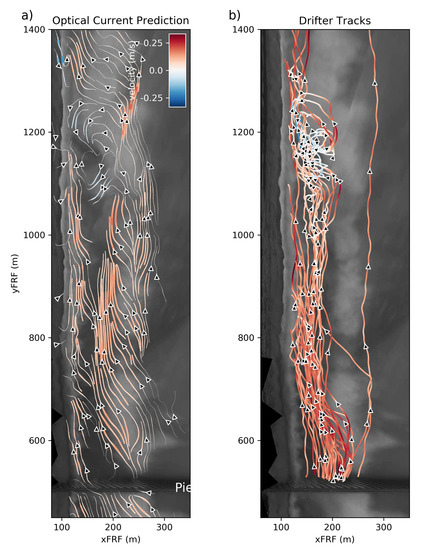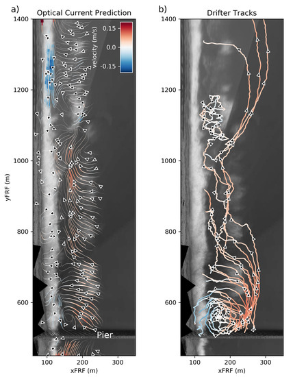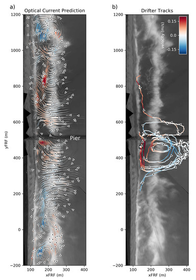 Offshore directed stream trajectories are also resolved in the remotely sensed velocities for 30 October 2019 at 14:00 (Figure 6) at a slight angle from north to south underneath the pier as well as at approximately equal alongshore distances away from the pier at yFRF = −100 m and yFRF = 1050 m. The angled rip under the pier matches the offshore trajectories of all of the drifters dropped into the water from the pier. After the drifters were ejected from the surf zone, they spent as long as 45 min in a region, where the optical estimates did not resolve velocities (outside of xFRF = 350 m between approximately yFRF = 400–500 m) but subsequently drifted back onshore across the sandbar and entered stronger alongshore flows in the trough. Divergences of alongshore flows at yFRF = 300 m and yFRF = 600 m are resolved in both the drifter trajectories and optical velocity estimates. Although the drifters rarely escaped the reciruclation cells north and south of the pier, the broader remotely sensed field highlights that the divergences in the trough are a consequence of feeder currents due to multiple rip currents in the domain.