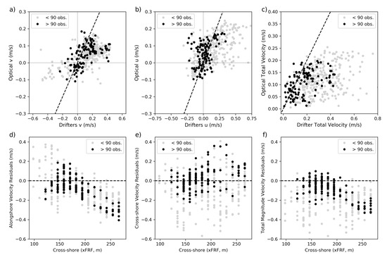 One-to-one comparison of average velocities from optical estimates and in situ drifters for 15 m by 15 m spatial bins on 22 October for (a) alongshore components, (b) cross-shore components, and (c) total velocity magnitudes. Optical velocities are average from complete 17 min WAM. Drifter velocities are averages of all drifter points in the spatial bin. Spatial bins with more than 90 drifter observations are denoted by black. Residual velocities (optical minus drifters) with respect to cross-shore coordinate for (d) alongshore components, (e) cross-shore components, and (f) total velocity magnitudes. Black dashed lines denote a perfect match in all subplots.