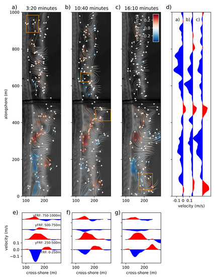 Two minute averages centered on three different times in the same video on 11 September 2019 are presented in (a–c) to highlight various processes that wave-averaged movie could aide in understanding and quantifying processes. The alongshore variation of average cross-shore velocity at points offshore of xFRF = 200 m from each snapshot in (a–c) are provided in (d). Cross-shore variation in longshore current are provided immediately beneath each map in (e–g). The four separate 250 m stretches of beach were averaged to highlight how the cross-shore profile of longshore current varies in both the alongshore direction and time. Orange boxes in (a–c) highlight transient eddies in the WAM.