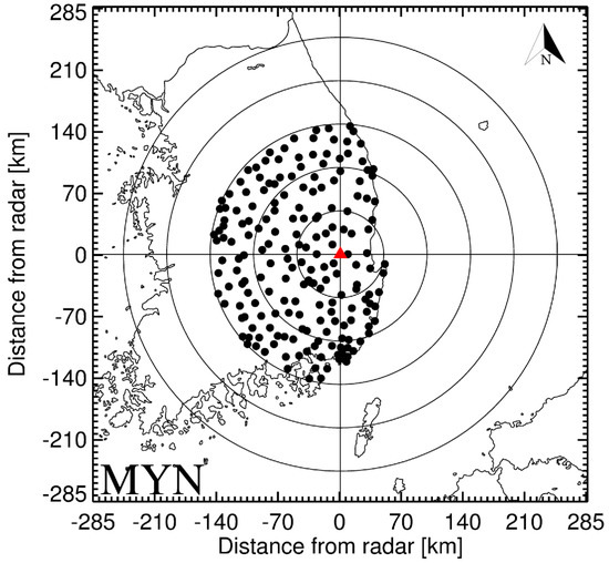 The weather radar used in this study was the MYN S-band dual-polarization radar operated by the Korea Meteorological Administration (KMA). Table 3 shows the detailed specifications of the MYN radar. A volume scan of nine elevation angles (0, 0.39, 0.83, 2, 2.88, 4.06, 5.67, 7.88, and 10.94) was performed every 10 min with a beam width of 0.92. The measured parameters were ZH, ZDR, KDP, , etc. ZH and ZDR were calibrated through post-processing. The averaged ZH calibration bias was calculated by the self-consistency principle of ZH and KDP, and the averaged ZDR calibration bias was conducted by comparing the ZDR and ZH radar measurements with the theoretical relationship between the same parameters simulated by the 2DVD [33,34]. The averaged calibration bias of ZH was −5.0 dBZ, and the averaged calibration bias of ZDR was 0.03 dB.
